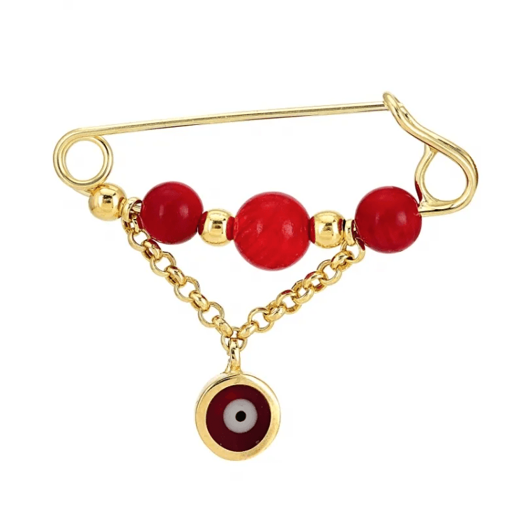 Altın Çocuk Takıları modellerinden Altın Göz Boncuklu Kırmızı İğne ürünümüz,