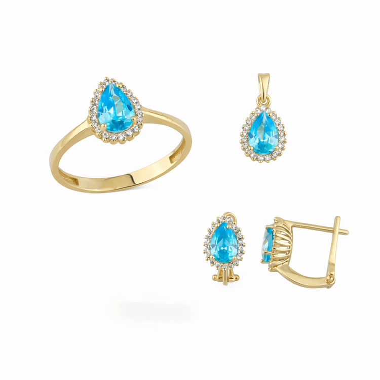 Taşlı Üçlü Set Takım Modelleri modellerinden Altın Mavi Damla Üçlü Takım ürünümüz, 5.85 gr ağırlığında 14 Ayar Altın.