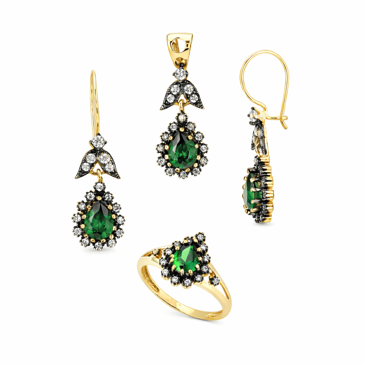 Taşlı Üçlü Set Takım Modelleri modellerinden Altın Saray Damla Yeşil Üçlü Takım ürünümüz, 8.30 gr ağırlığında 14 Ayar Altın.