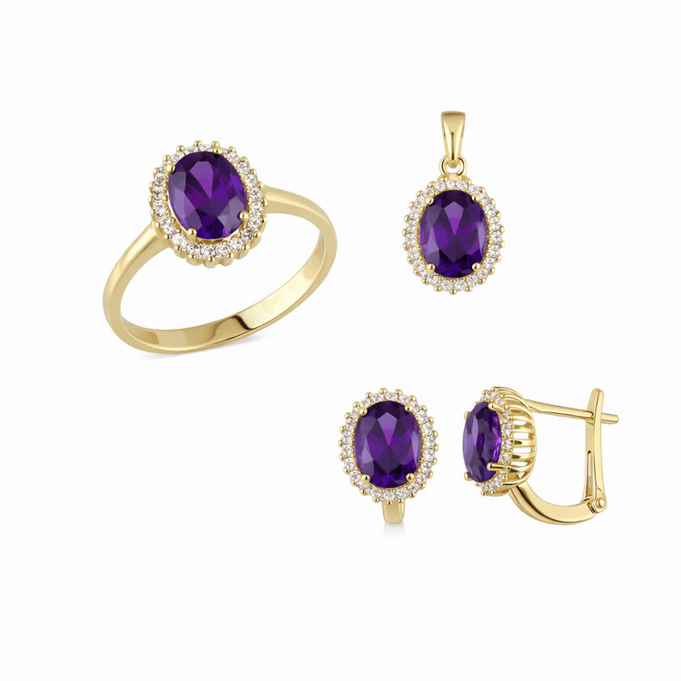Taşlı Üçlü Set Takım Modelleri modellerinden Altın Üçlü Takım Mor Taşlı ürünümüz, 6.40 gr ağırlığında 14 Ayar Altın.