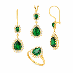 Taşlı Üçlü Set Takım Modelleri modellerinden Altın Zümrüt Yeşili Damla Üçlü Takım ürünümüz, 8.30 gr ağırlığında 14 Ayar Altın.
