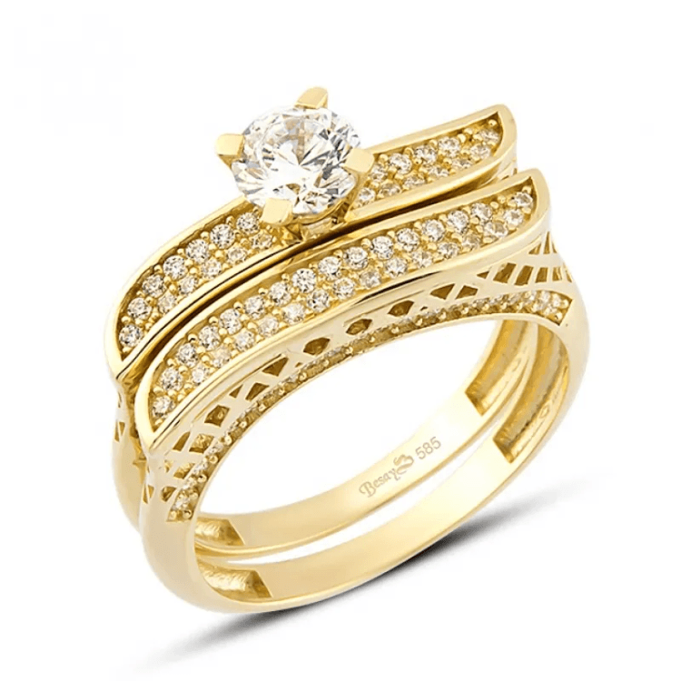 Altın Yüzükler modellerinden Çiftli Yüzük Yüksek Taş İşlemeli ürünümüz,