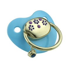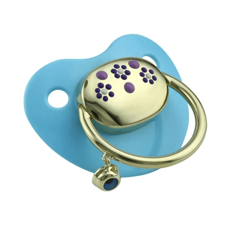 Altın Çocuk Takıları modellerinden Renkli Papatya Desenli Mavi Altın Emzik ürünümüz, 2.82 gr ağırlığında 14 Ayar Altın.