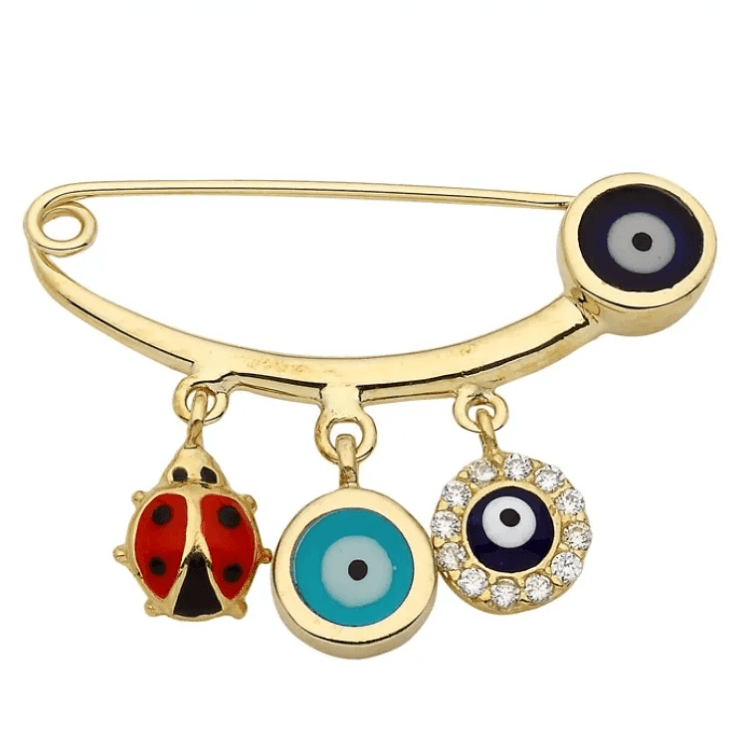 Altın Çocuk Takıları modellerinden Uğur Böcekli Taşlı Çengelli İğne ürünümüz,