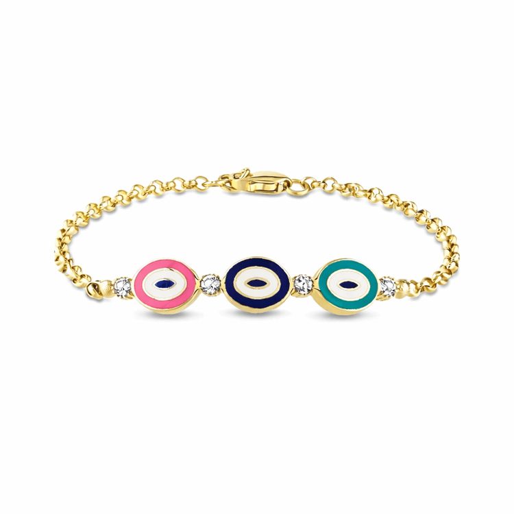 Altın Çocuk Takıları modellerinden Yuvarlak Pembe Siyah Mavi Taşlı Çocuk Künyesi ürünümüz,