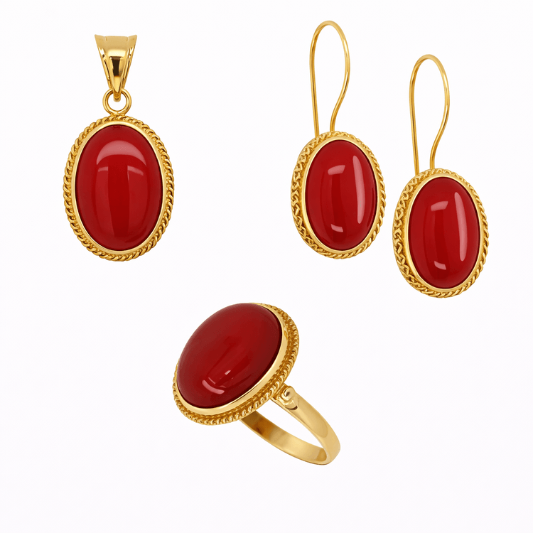 Taşlı Üçlü Set Takım Modelleri modellerinden Akik Taşlı Altın Üçlü Takım ürünümüz, 10.38 gr ağırlığında 14 Ayar Altın.