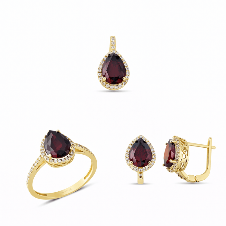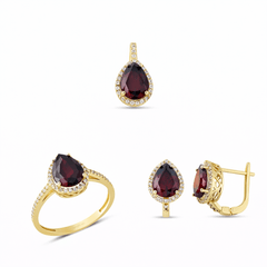 Taşlı Üçlü Set Takım Modelleri modellerinden Altın Üçlü Takım Bordo Damla Taşlı ürünümüz, 8.38 gr ağırlığında 14 Ayar Altın.
