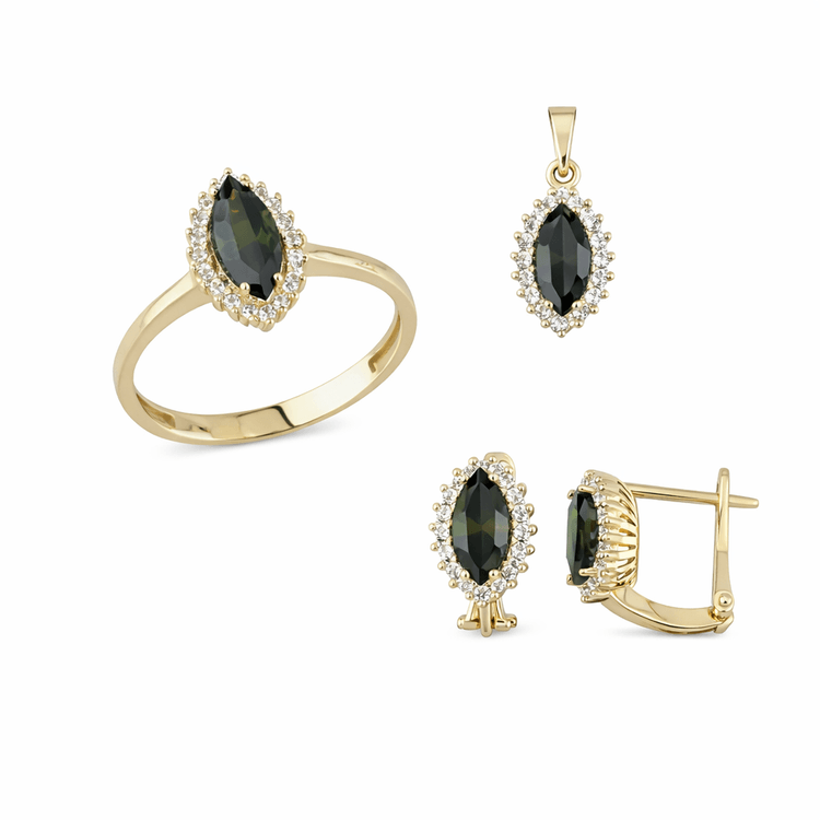 Taşlı Üçlü Set Takım Modelleri modellerinden Altın Üçlü Yeşil Taşlı Takım ürünümüz, 5.90 gr ağırlığında 14 Ayar Altın.