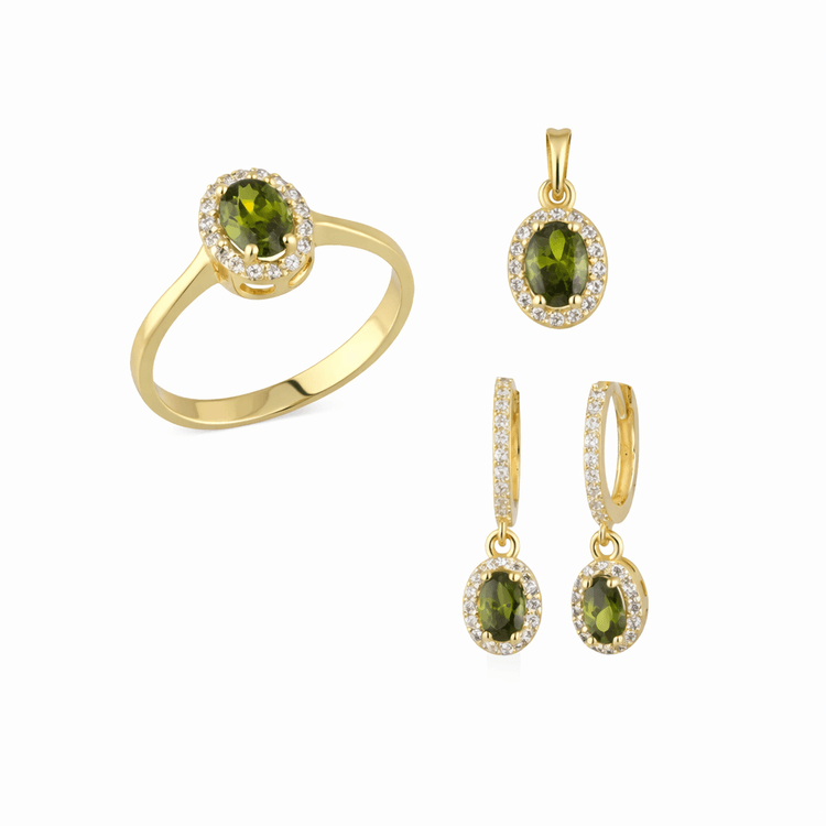 Taşlı Üçlü Set Takım Modelleri modellerinden Altın Yeşil Oval Taşlı Üçlü Takım ürünümüz, 4.30 gr ağırlığında 14 Ayar Altın.