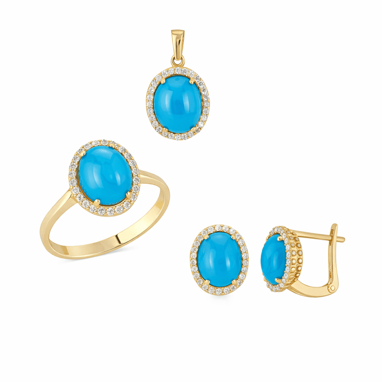 Taşlı Üçlü Set Takım Modelleri modellerinden Firuze Oval Altın Üçlü Takım ürünümüz, 8.14 gr ağırlığında 14 Ayar Altın.