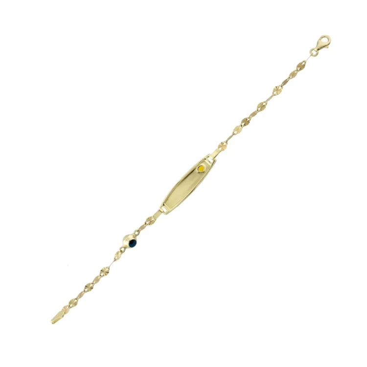 Altın Çocuk Takıları modellerinden Göz Boncuklu İsim Yazılabilen Sarı Kalpli ürünümüz,