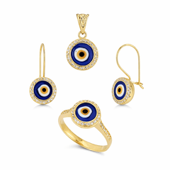 Taşlı Üçlü Set Takım Modelleri modellerinden Nazar Boncuklu Üçlü Takım ürünümüz, 8.46 gr ağırlığında 14 Ayar Altın.